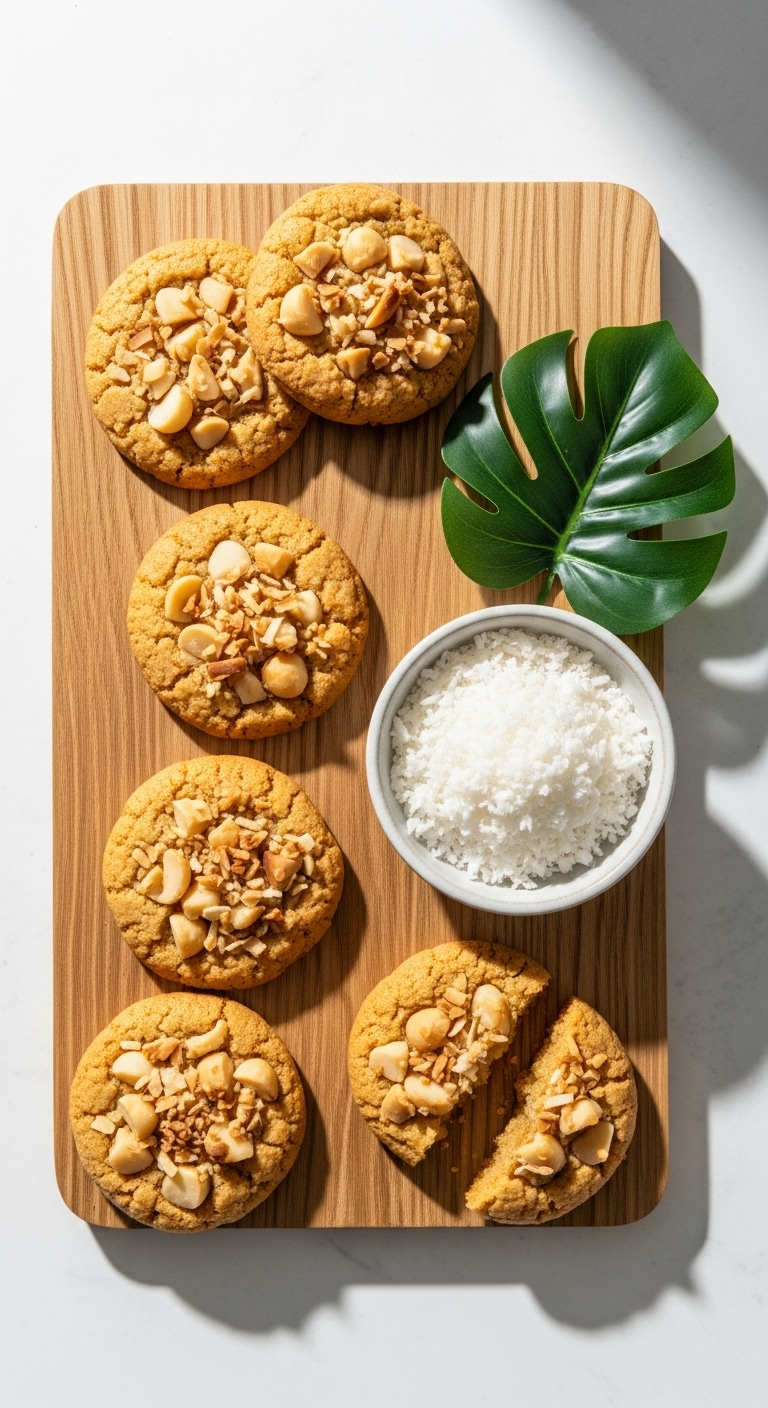These tropical cookies are chewy with a crunchy nut contrast. Sourdough discard keeps crumbs tender and slightly tangy. Toasted coconut adds aroma kids enjoy. Macadamias bring buttery bites that balance sweet.