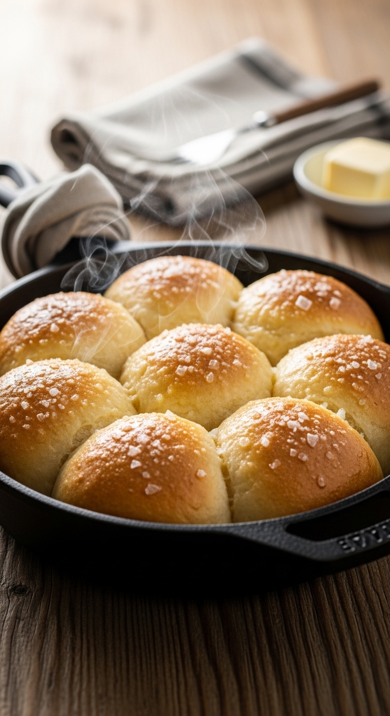 Serve warm in a basket lined with a linen napkin. Garnish with extra melted butter and flaky sea salt. Pair with roast chicken, mashed potatoes, or soup. Store cooled rolls in an airtight container up to 3 days. Reheat in a 300°F oven for 8–10 minutes. Freeze baked rolls up to 2 months; thaw and warm before serving.