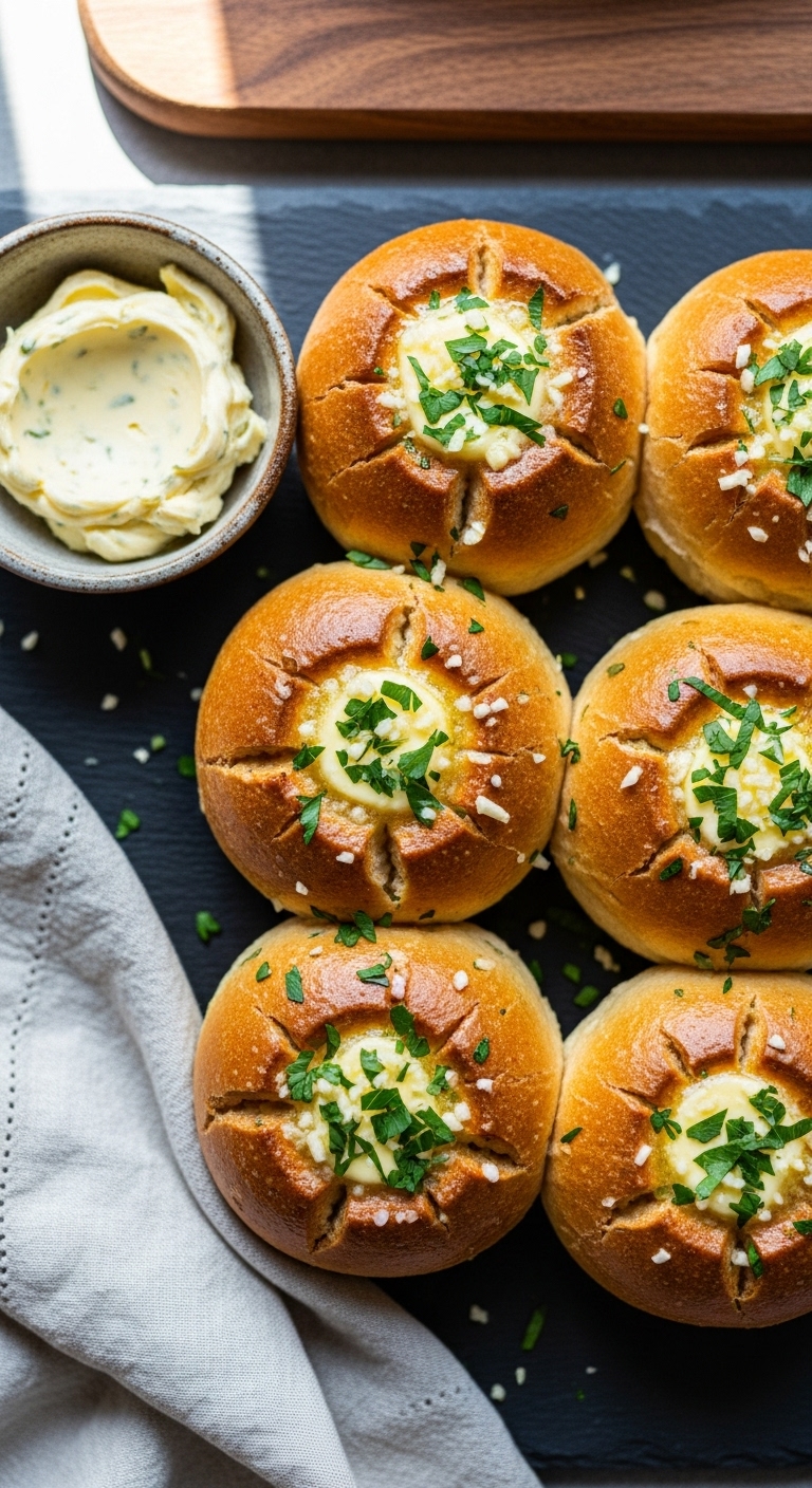 Serve on a wooden board with herb butter. Garnish with extra chopped parsley and a garlic butter drizzle. Pair with tomato-based pastas, grilled vegetables, or a crisp salad. Store in a resealable bag up to 2 days. Reheat in a toaster oven for 6–8 minutes. Make dough ahead and refrigerate for a slow overnight rise.