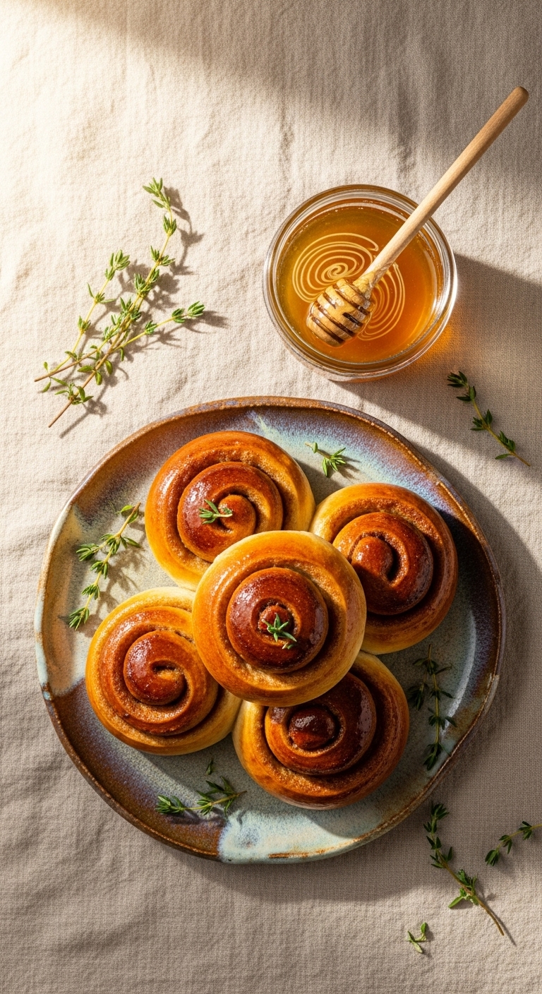 Serve on a platter with softened honey butter. Garnish with thyme or a light dusting of powdered sugar for brunch. Pair with smoked ham, tea, or coffee. Store cooled rolls in an airtight container up to 3 days. Reheat gently in oven at 325°F for 8 minutes. Dough can be mixed the night before and refrigerated for an overnight rise.