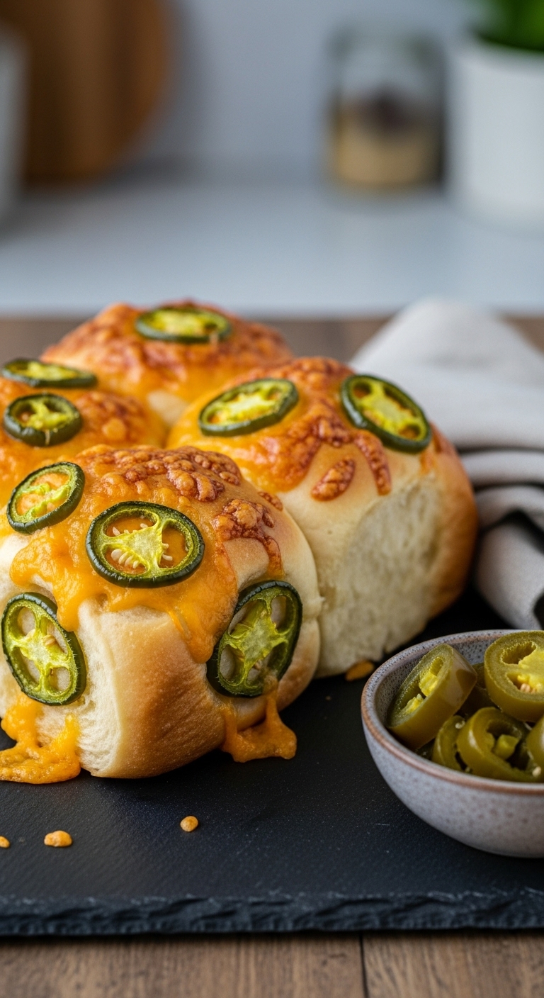 Serve warm with extra cheddar on the side or a small bowl of marinara for dipping. Garnish with chopped chives or scallions. Pair with soups or barbecue. Store cooled rolls in airtight container 2 days. Reheat in oven at 325°F for 8–10 minutes. Make ahead: shape and freeze unbaked rolls; bake from frozen with extra bake time.