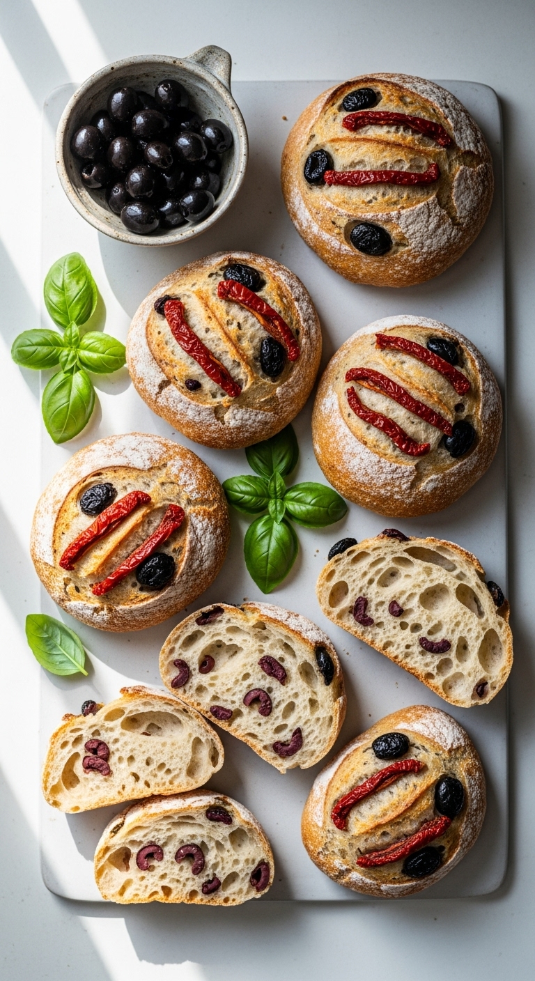 Serve with olive oil and balsamic dip or a spread of goat cheese. Garnish with fresh basil or thyme. Pair with Mediterranean mains or charcuterie. Store in airtight container for 2 days. Reheat in a warm oven for 8 minutes. Dough freezes well before shaping.