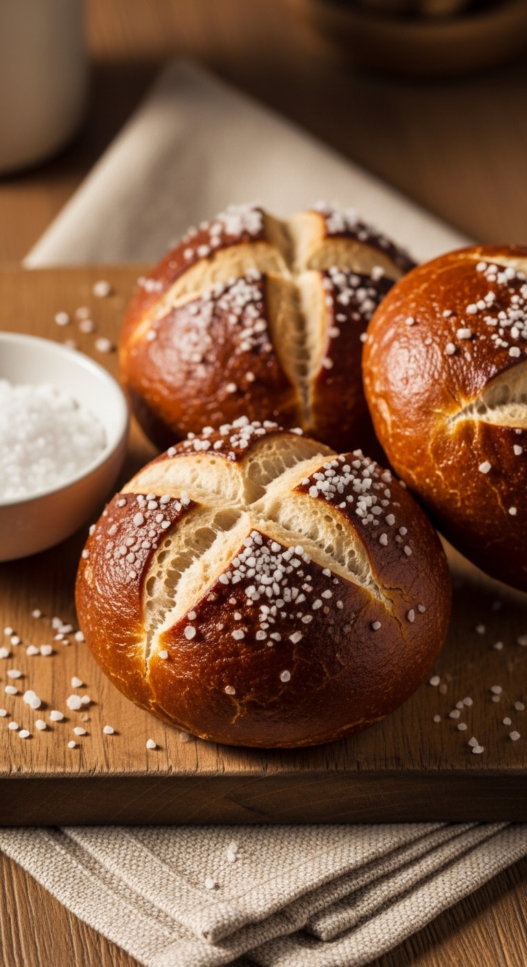 Serve with yellow mustard, beer cheese, or a creamy dip. Garnish with extra coarse salt and fresh herbs for contrast. Pair with sausages or burgers. Store in paper bag to keep crust for 1 day; reheat in oven to refresh crust. Make dough ahead and refrigerate for slow flavor development.