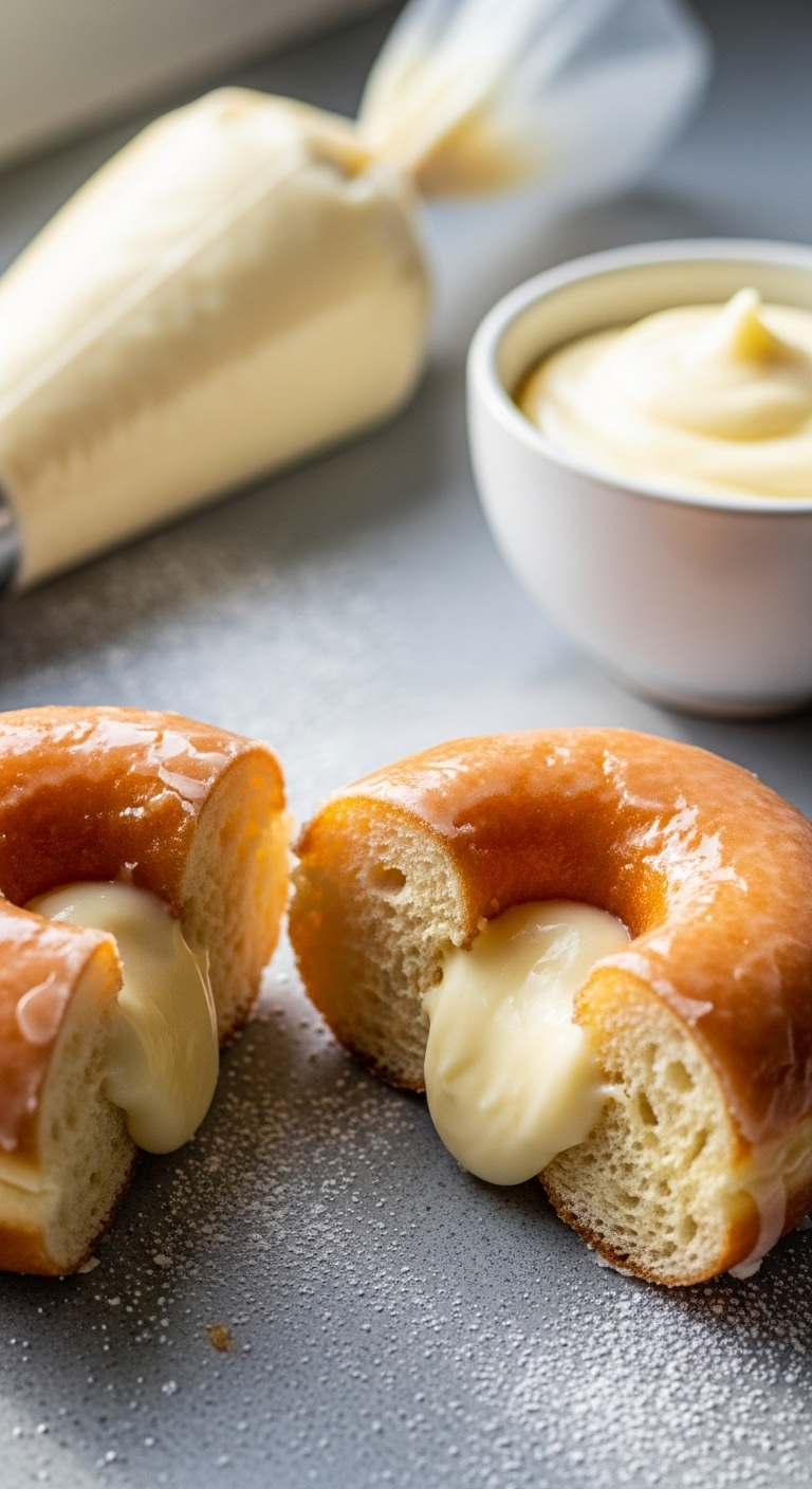 - Cool donuts slightly. Fill a piping bag fitted with a 1/4-inch tip with chilled custard. Poke a hole and pipe 2–3 tbsp custard into each donut.