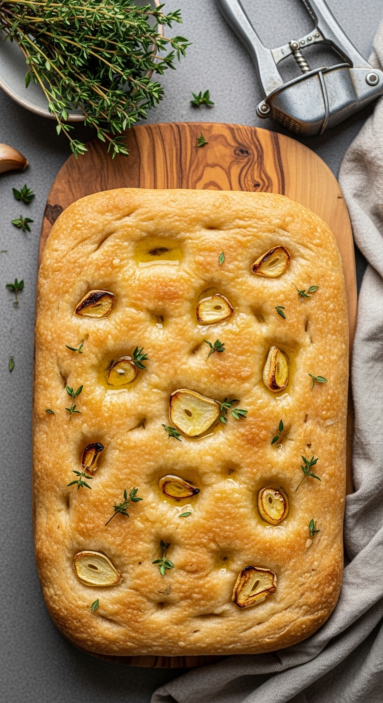 This garlic and thyme focaccia is savory and aromatic. Thin garlic slices blister and sweeten as they bake. Thyme adds citrusy, woody notes that brighten the crumb. It’s perfect as a side for roasted vegetables or with olive-oil dipping. You’ll love the warm garlic scent and tender chew.