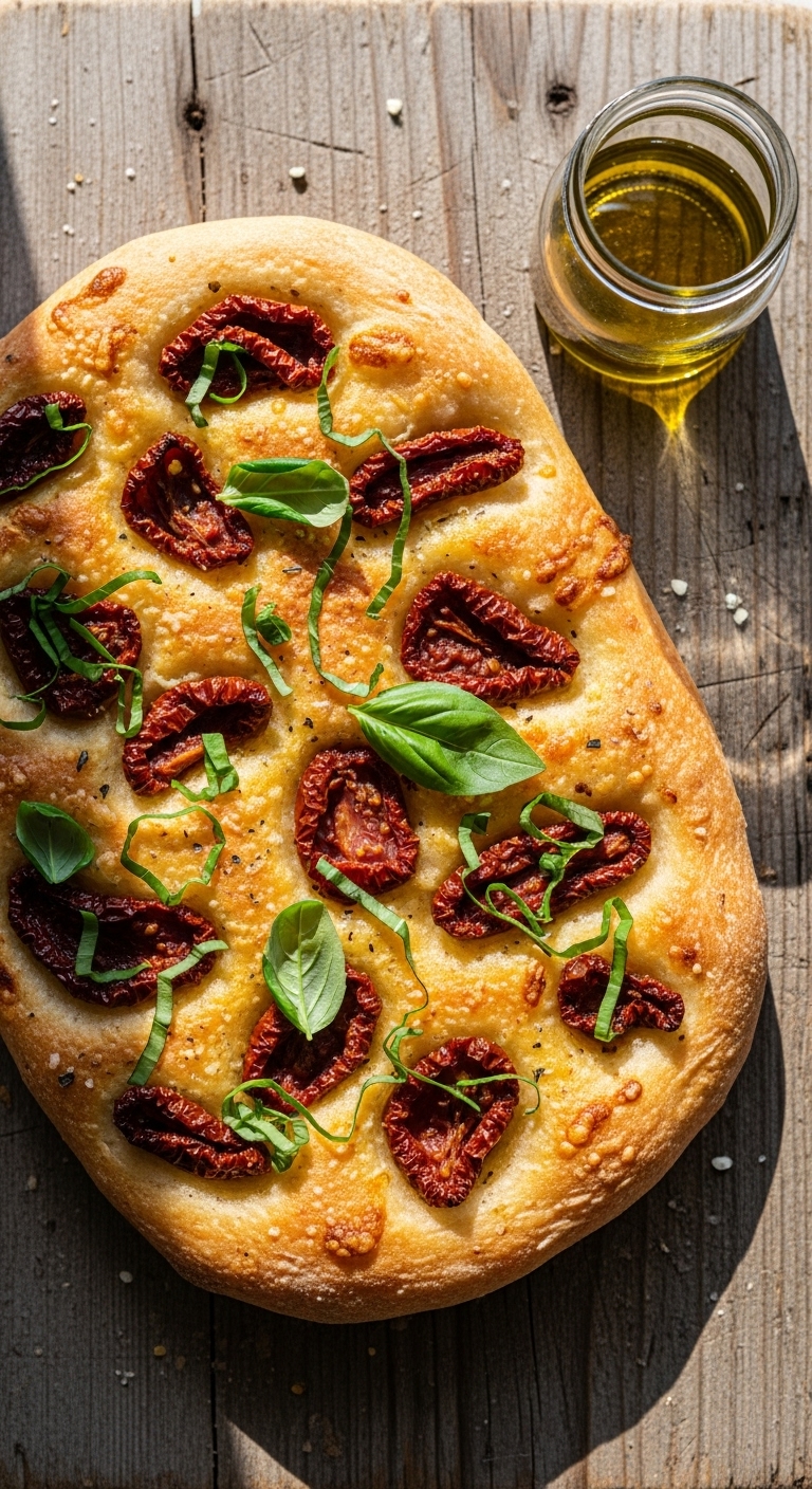 Sundried tomato and basil create a concentrated, sweet-tart topping. The sourdough discard keeps the crumb soft and airy. This focaccia works well in summer salads or sandwich stacks. Expect chewy bites with herb brightness and tomato umami.