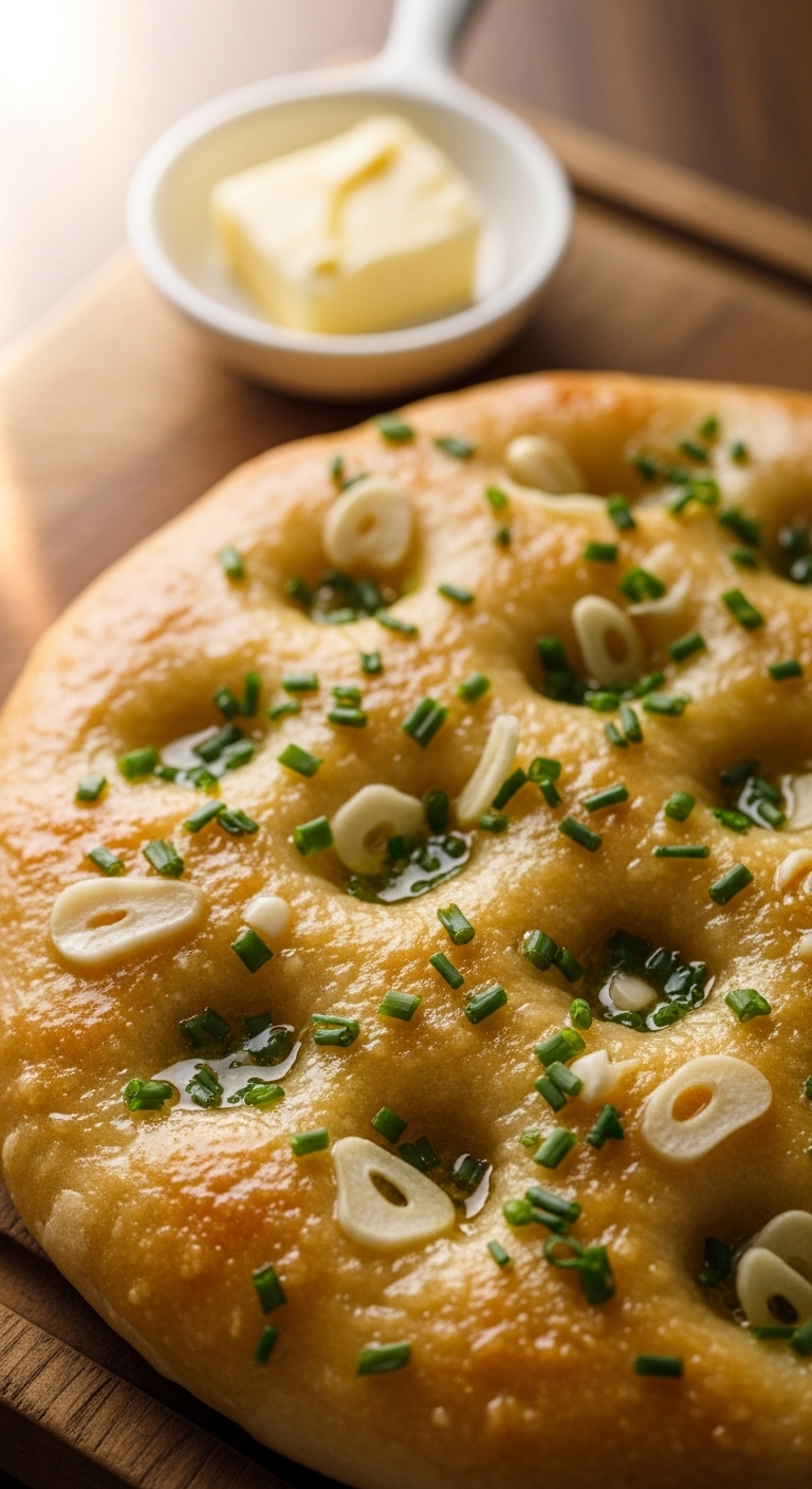 This focaccia uses melted butter and chopped chives for a softer, slightly richer crust. Garlic slices caramelize for sweet, savory pockets. The sourdough discard ensures a light interior and tender crumb. It pairs beautifully with soups and egg dishes.