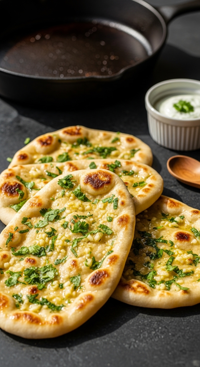 Serve stacked on a warm platter, brushed with extra garlic butter. Garnish with more cilantro and a pinch of flaky sea salt. Pair with butter chicken, dal makhani, or a tangy tomato curry. Store cooled naan in a sealed bag for up to 2 days in the fridge. Reheat in a hot skillet for 30 seconds per side. For make-ahead, freeze flat stacked with parchment between layers.