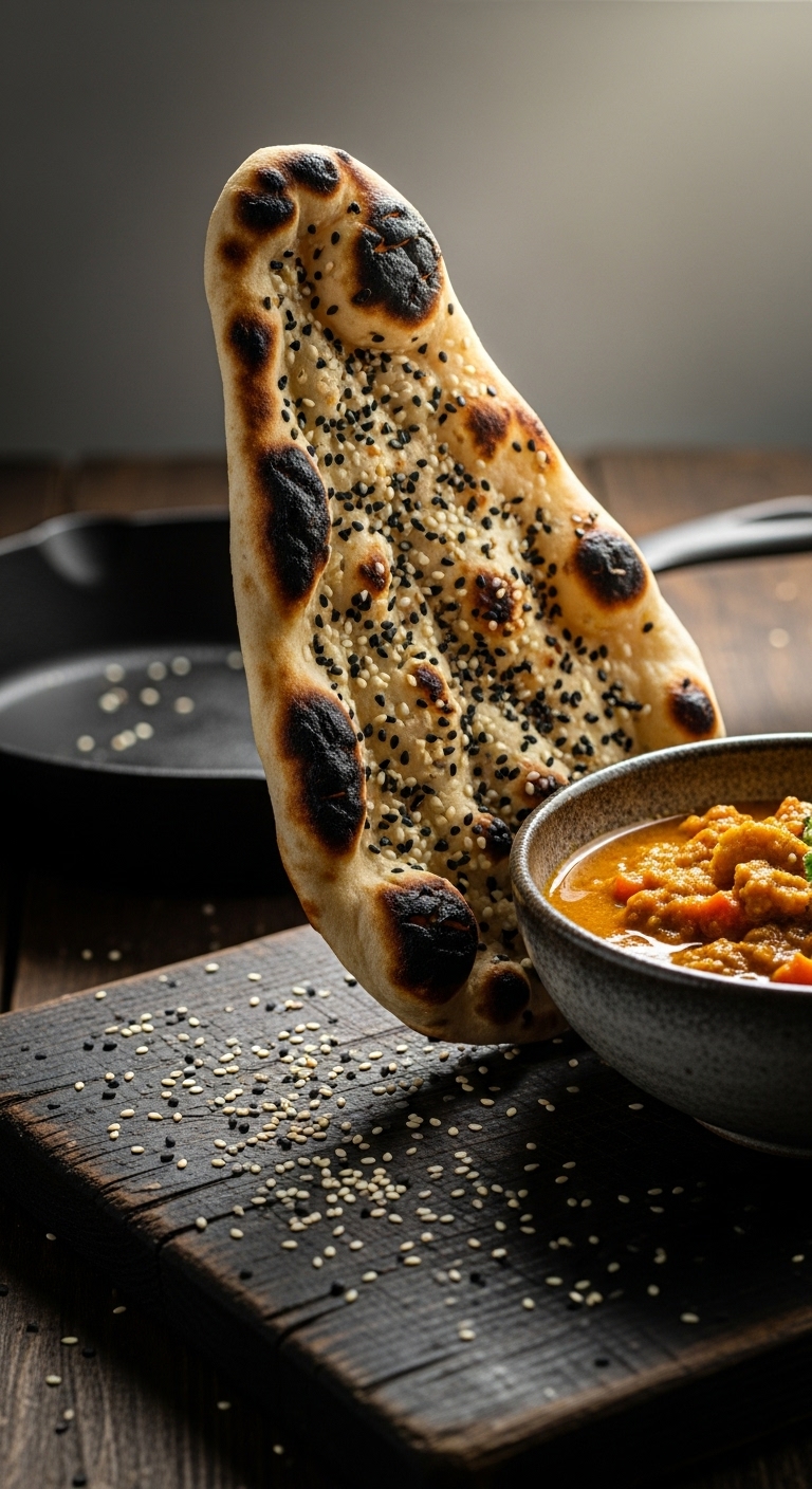 This skillet naan gets real char and smoky flavor from high heat. Sesame seeds add a toasty crunch on top.