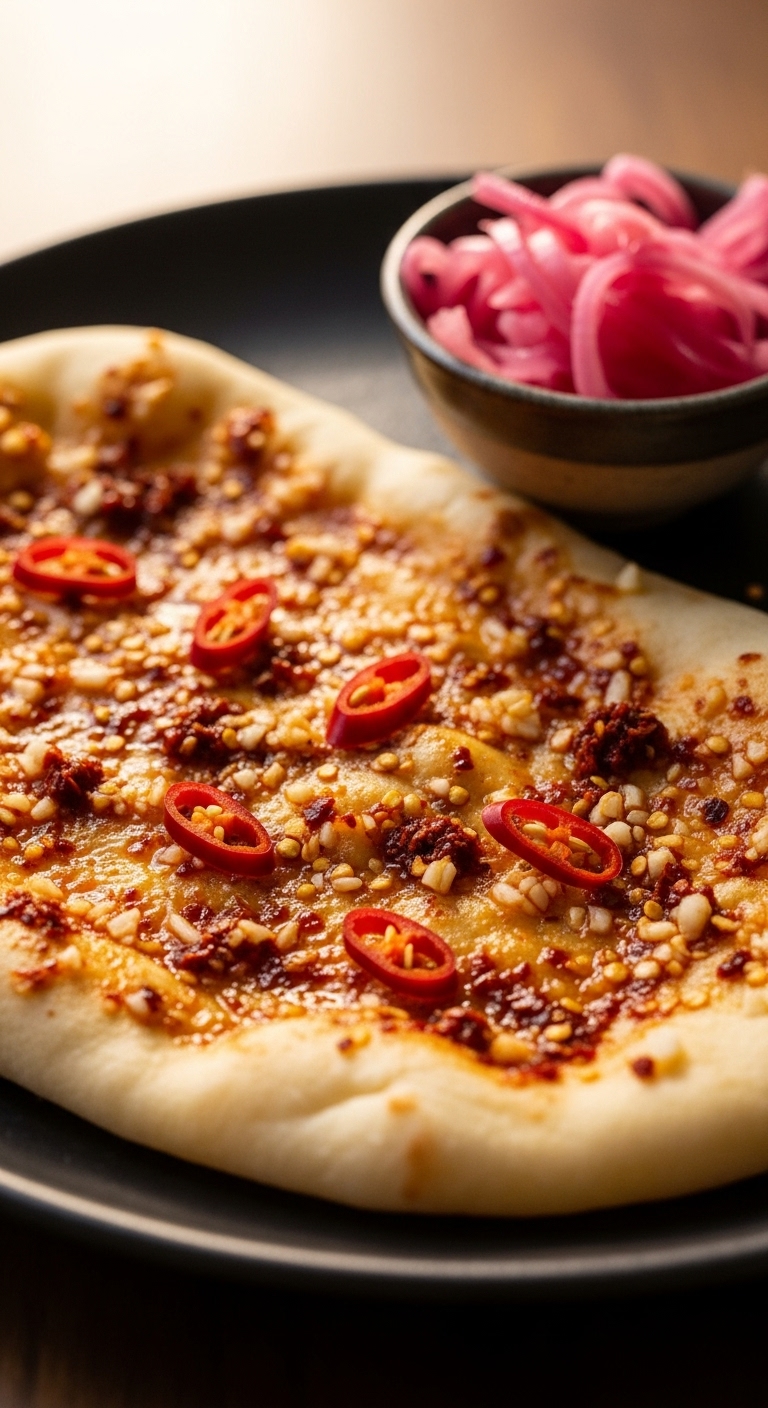 It pairs with tomato-based curries and fusion dishes. You’ll get a crispy edge and a cheesy, umami hit with each bite.