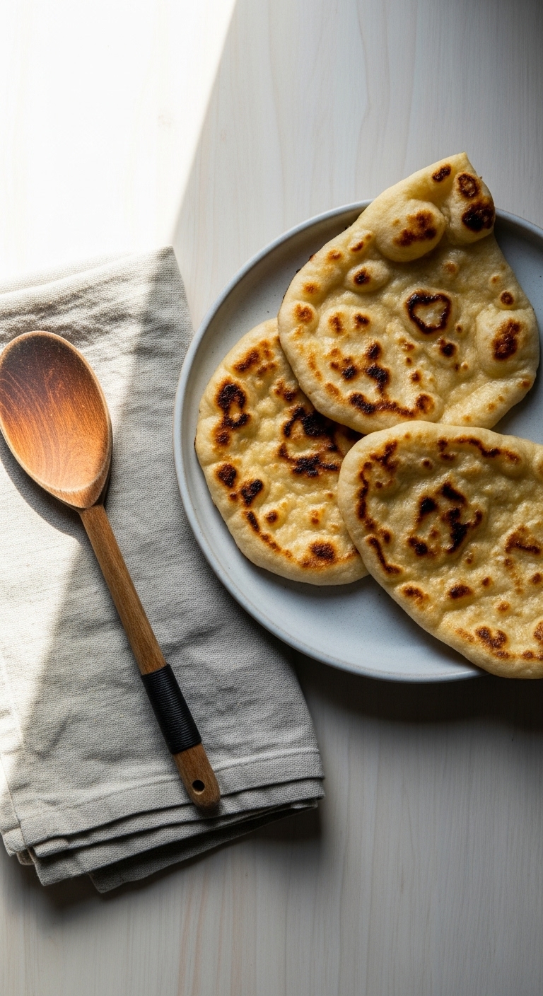 Stack on a wooden board and brush between layers with butter to keep moist. Pair with spicy lamb curry or chickpea curry. Store cooled naan in an airtight container for 2 days. Reheat in a hot oven at 350°F (175°C) for 5–7 minutes. Freeze for up to 2 months, thaw, then reheat.