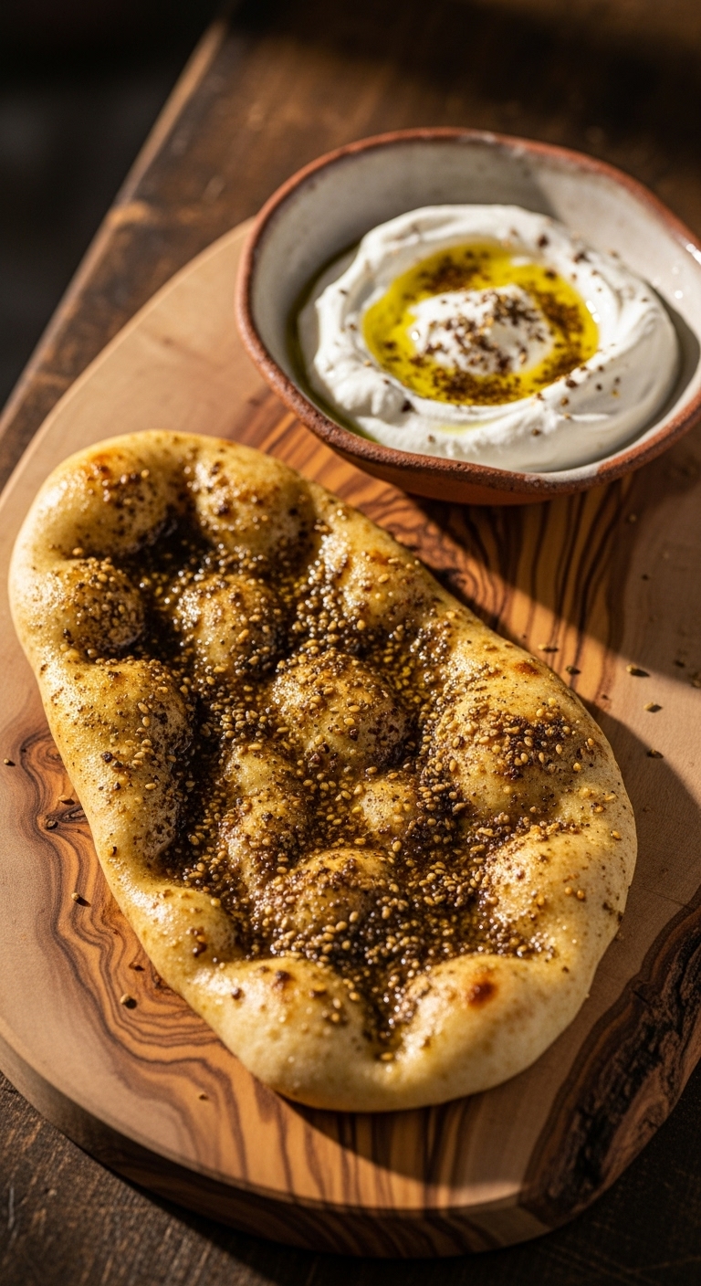 Serve torn pieces with labneh, pickled vegetables, or hummus. Great with eggplant or chickpea curries. Store wrapped for 2 days. Reheat in a warm oven for best texture. Za’atar naan also makes a flavorful sandwich base.
