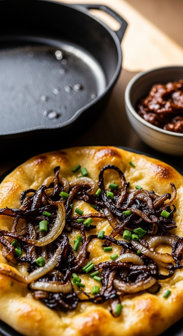 - Check doneness by ensuring onions are caramelized and dough is cooked through.