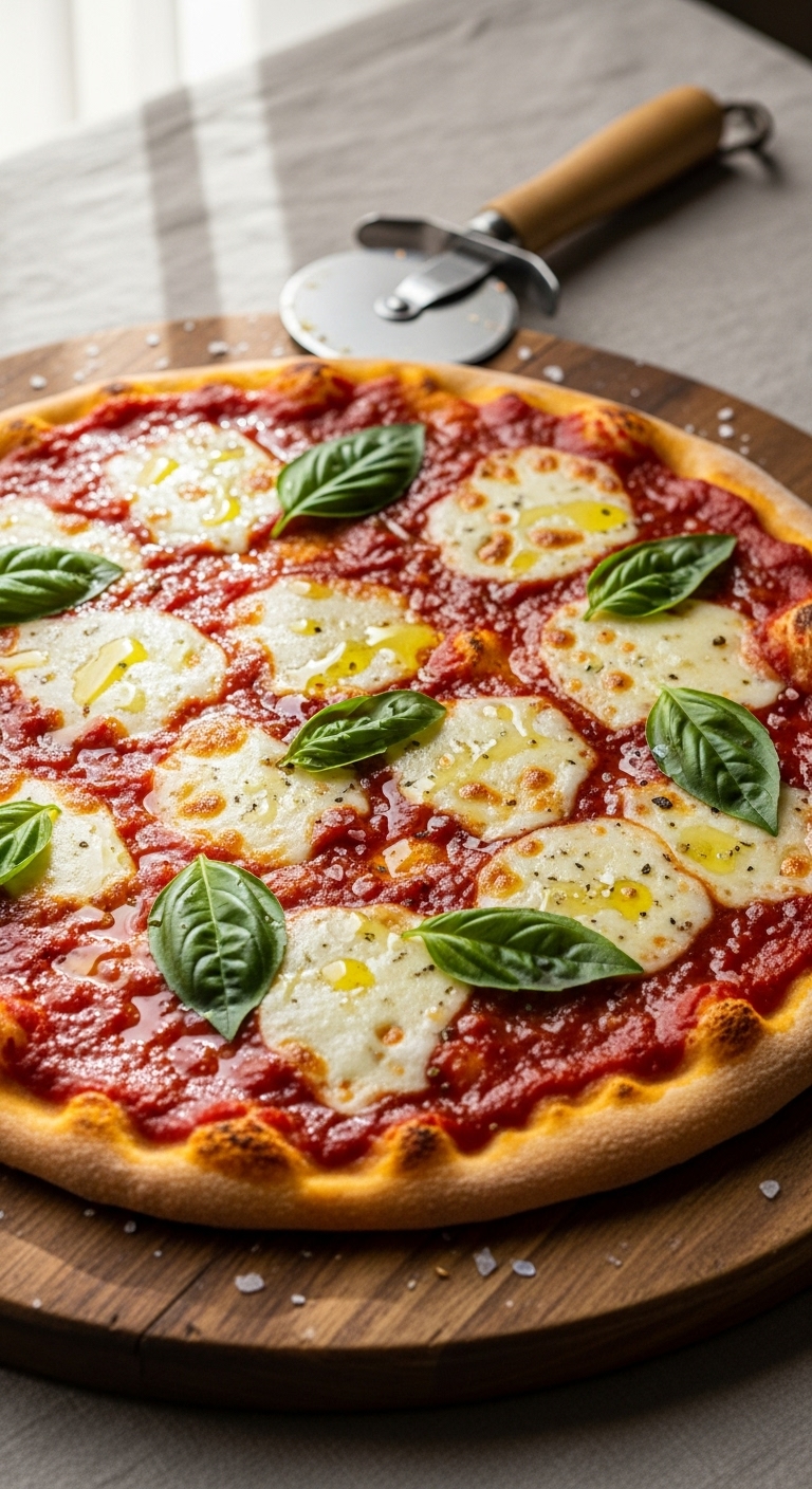 Serve on a wooden board for rustic appeal. Garnish with fresh basil and a few extra drops of olive oil. Pair with a crisp white wine or sparkling water with lemon. Store leftovers in an airtight container for 2 days; reheat in a hot oven for best crispness. Make dough ahead by refrigerating for up to 24 hours; bring to room temperature before baking.