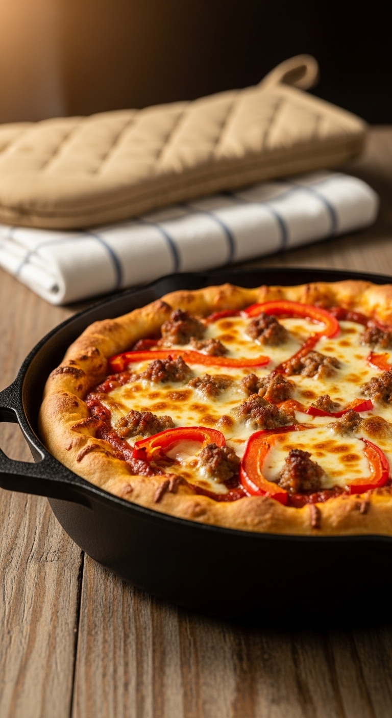 Serve straight from the skillet for dramatic presentation. Garnish with fresh basil and a drizzle of olive oil. Pair with a robust red wine or cola. Store leftovers in fridge for 3 days; reheat in oven or skillet to restore crunch. Make dough the night before and refrigerate for deeper flavor.