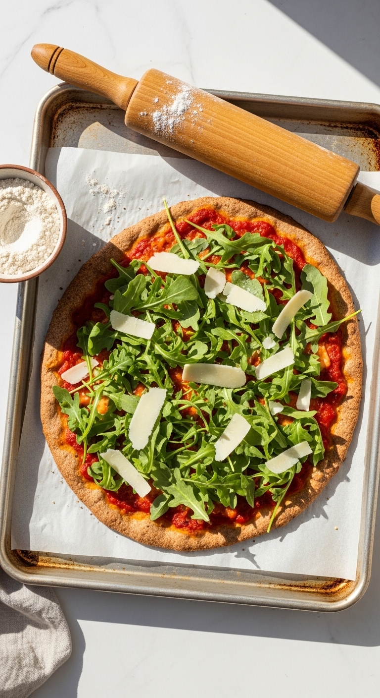 - Add toppings—think arugula, prosciutto after baking, shaved Parmesan.