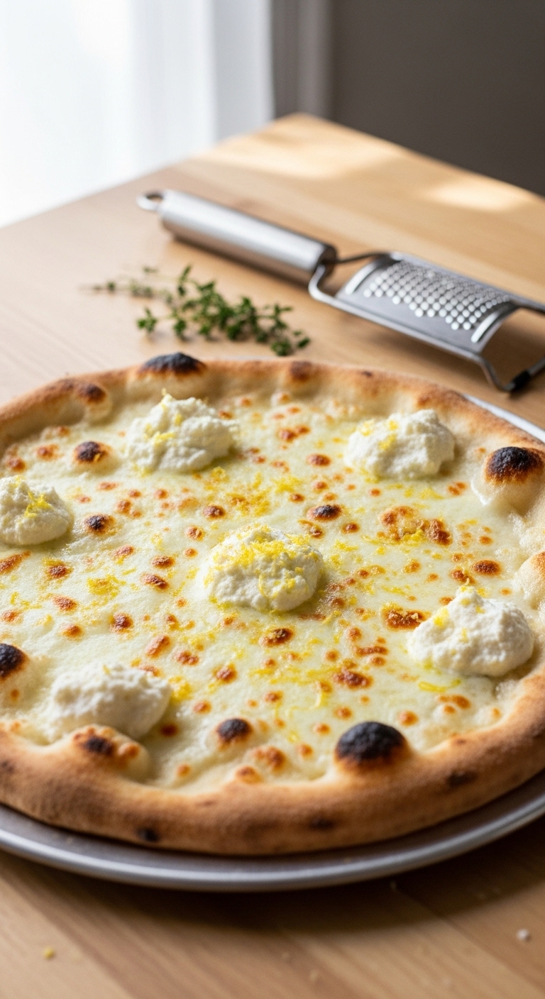 - Dollop ricotta, sprinkle mozzarella and Parmesan, and add thyme and lemon zest.