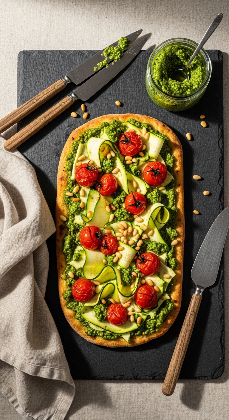 This pesto veggie flatbread turns sourdough discard into a crisp, herb-packed canvas. The crust stays thin and crunchy under roasted vegetables. Pesto adds fresh, garlicky flavor and a vibrant green color. Perfect for spring or summer gatherings and lighter meals. You’ll taste bright basil and warm roasted veggies.