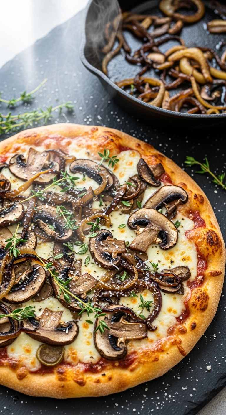This mushroom and caramelized onion pizza balances rich umami with sweet onions on a crisp sourdough discard crust. The crust stays sturdy under sautéed toppings and releases a toasty scent. Thyme adds an earthy lift. Ideal for cozy dinners and mushroom lovers. Expect deep, savory flavors and a slightly sweet finish.
