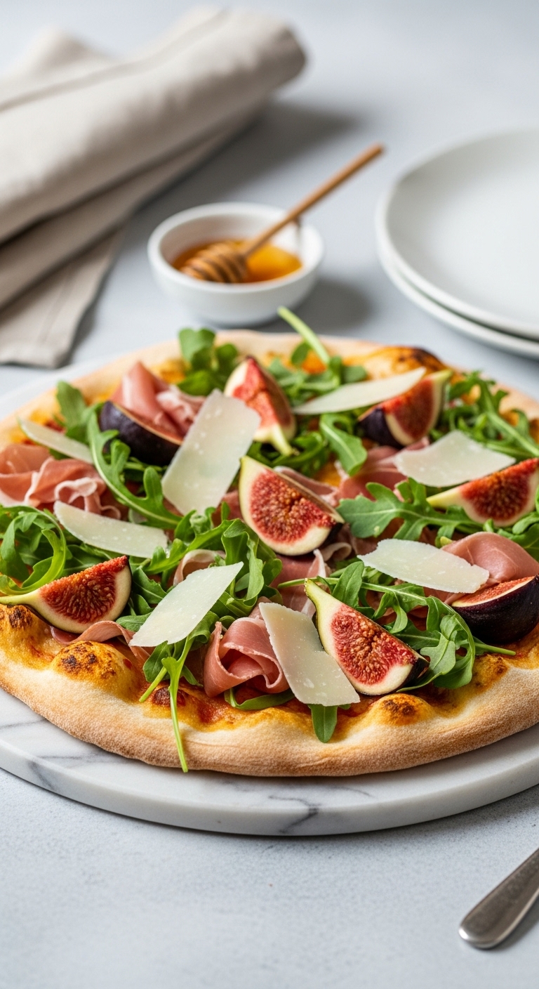 Serve on a light-colored platter to show off figs and prosciutto. Add extra shaved Parmesan and a final honey drizzle. Pair with a chilled Prosecco or dry white wine. Store leftovers in fridge 1–2 days and re-crisp in the oven. Slice fresh figs and prosciutto right before serving for best texture.
