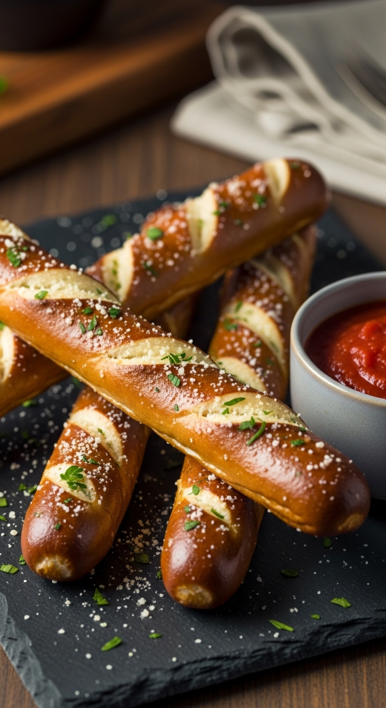Arrange sticks in a ceramic bowl beside marinara and pesto aioli. Garnish with extra Parmesan and parsley. Pair with a crisp white wine or tomato soup. Store leftovers in the fridge up to 2 days; reheat at 350°F for 6–8 minutes. Make dough the night before for faster assembly.