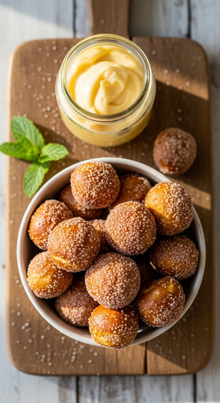Pile bites in a small basket and serve with honey butter or chocolate dip. Garnish with a dusting of cinnamon. Pair with coffee, chai, or warm cider. Store in an airtight container up to 2 days. Reheat briefly to refresh the sugar coating. You can shape these the morning of your event and bake when guests arrive.
