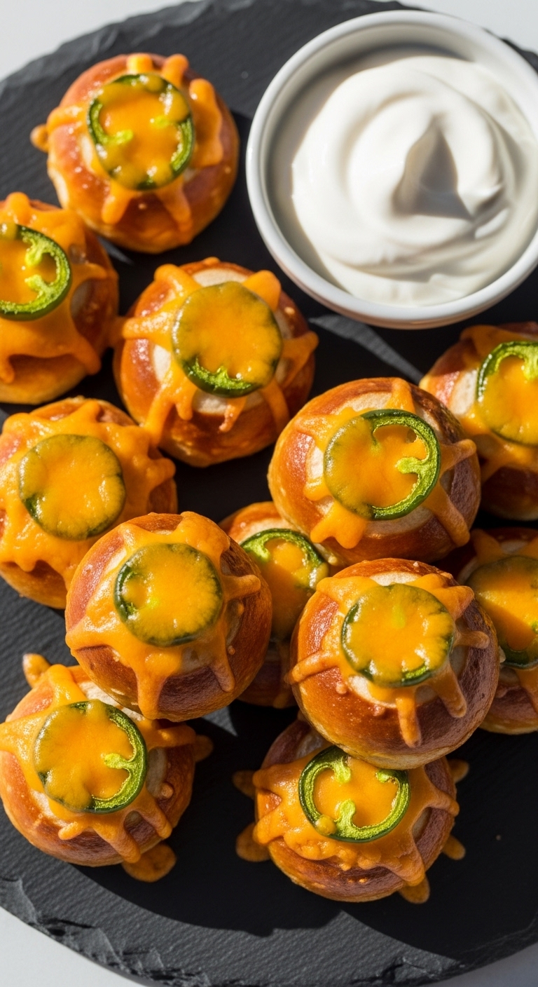 Serve bites with sour cream or a cilantro-lime dip. Garnish with extra shredded cheddar and sliced jalapeño rounds. Pair with a crisp lager or citrus soda. Store in the fridge up to 2 days; reheat at 350°F for 6–8 minutes. You can shape and chill dough ahead; bake fresh before guests arrive.