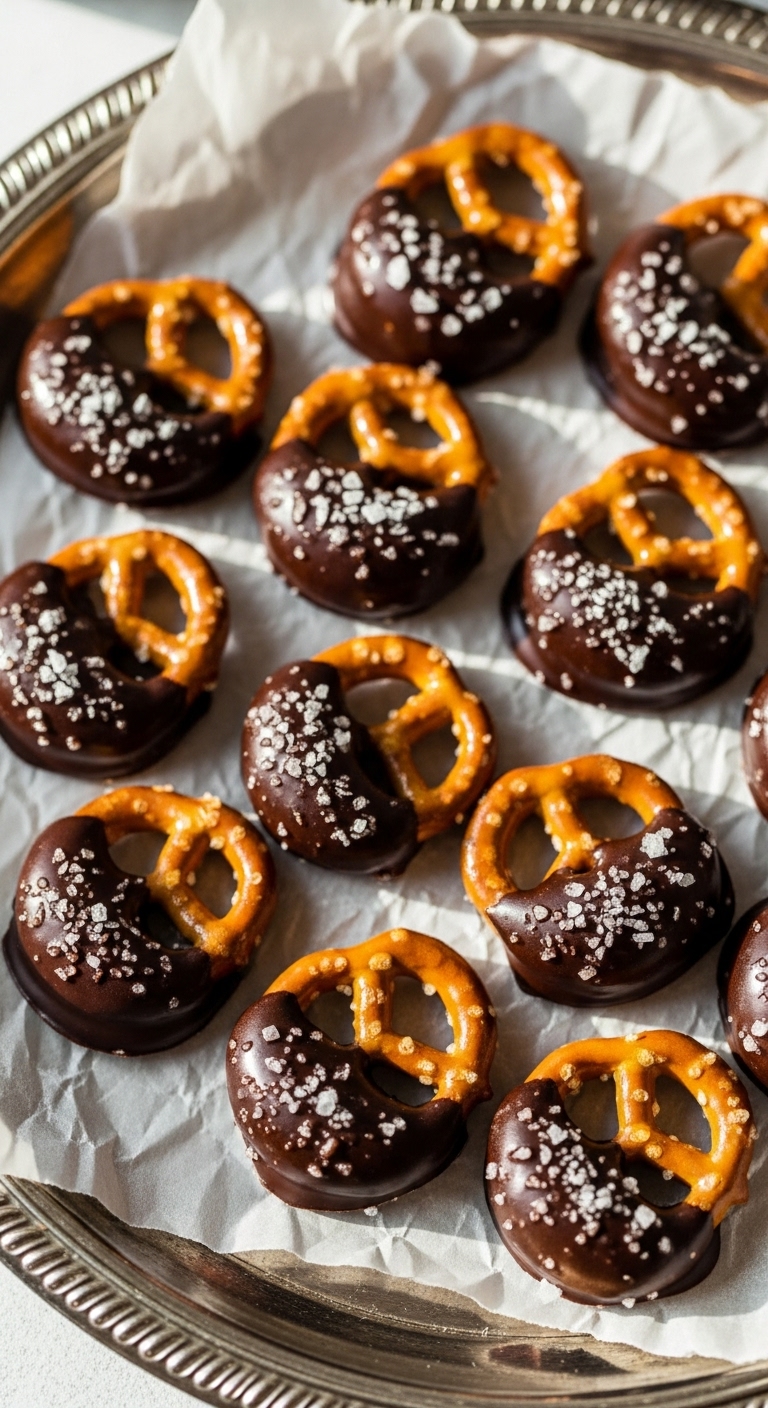 - Dip half of each bite in chocolate, place on parchment, and sprinkle flaky sea salt.