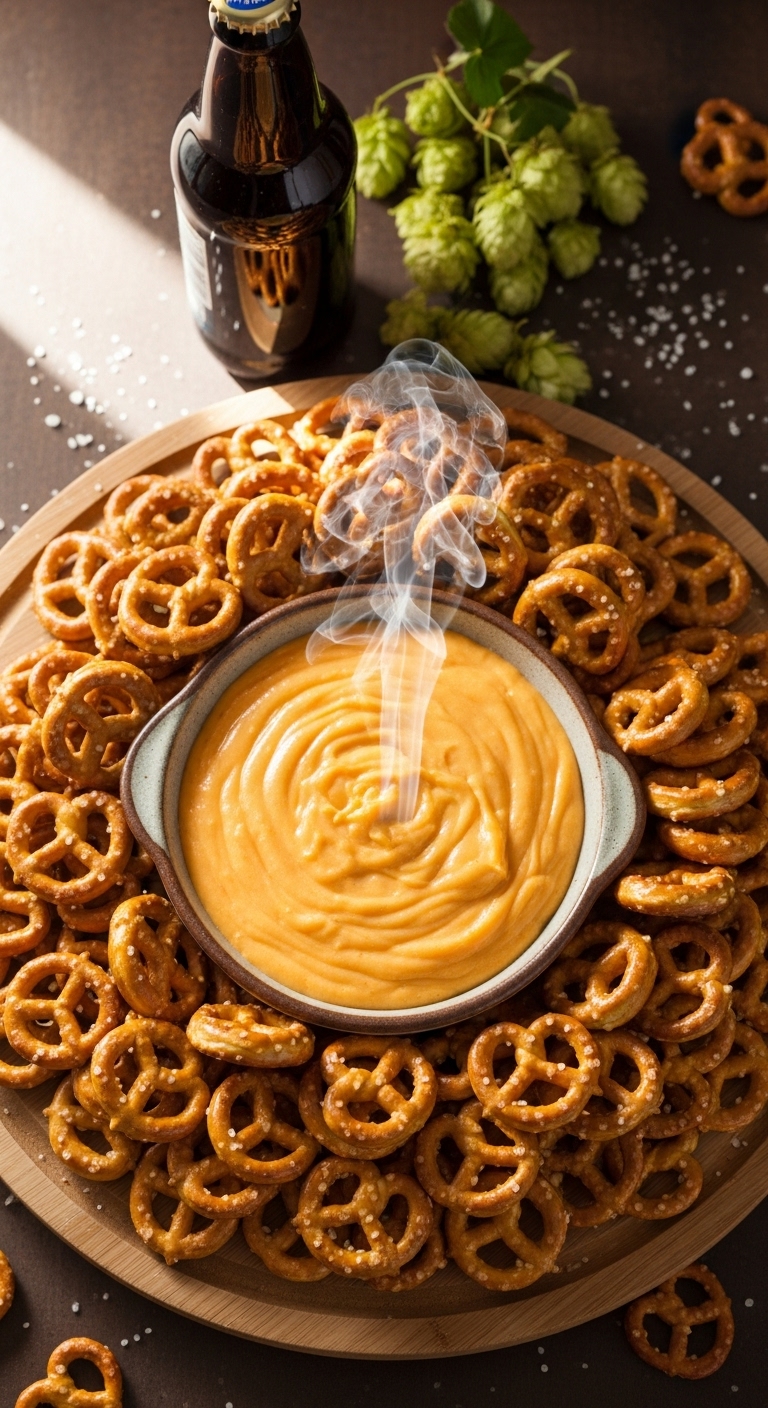 Arrange bites around a warm bowl of beer cheese on a wooden board. Garnish dip with chopped chives and a sprinkle of smoked paprika. Pair with a cold pale ale or cider. Store leftover dip in the fridge up to 3 days; reheat gently with a splash of milk. Freeze unbaked bites in a single layer, then bake from frozen, adding a few minutes to bake time.