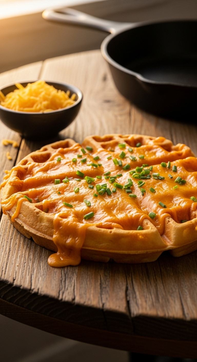 These savory waffles turn breakfast into a full meal. Sharp cheddar and fresh chives add savory depth. The sourdough discard gives a tangy counterpoint to the cheese.