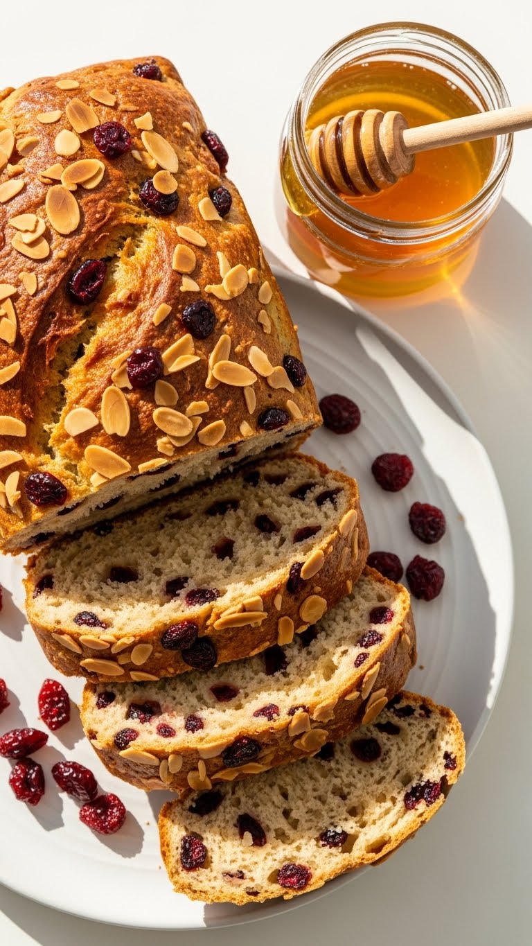 Serve with a smear of cream cheese or mascarpone. Garnish with extra almonds and orange zest for color. Pairs with hot tea or mulled cider. Keeps well in an airtight container for 3–4 days or frozen slices for longer.