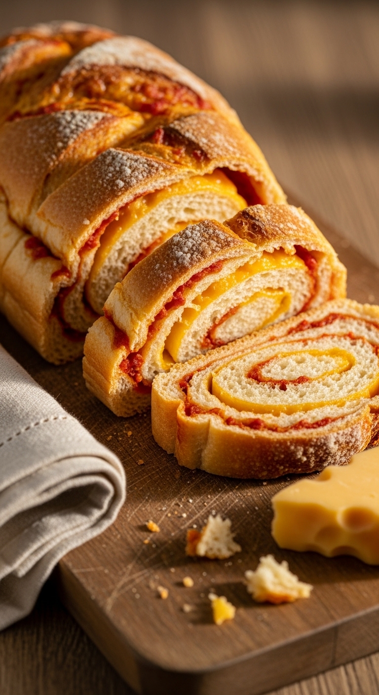 This loaf folds sharp cheddar and sun-dried tomatoes into a striking savory swirl. The cheddar melts into pockets during baking.