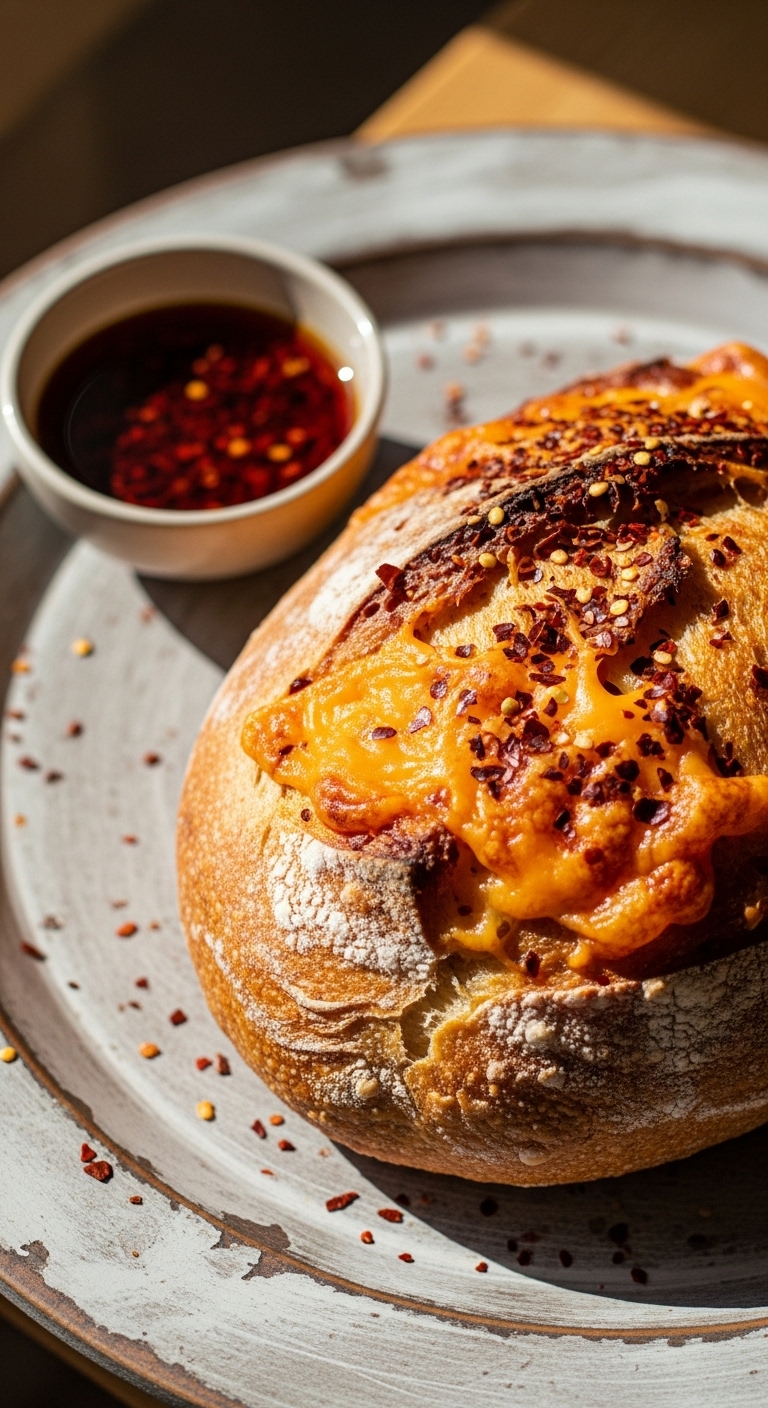 You’ll taste a warm, lingering heat with cheesy richness and bright tomato pieces. The crumb has a satisfying chew and spicy aroma.