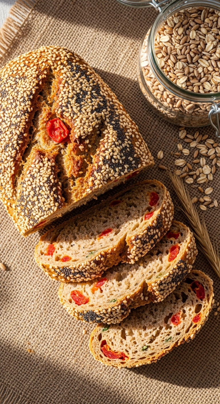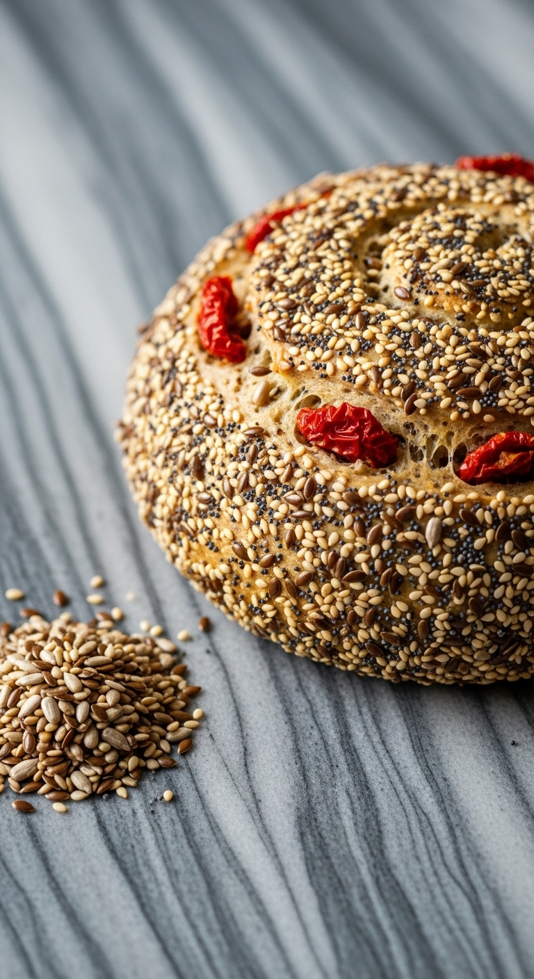 This loaf sports a crunchy seed crust for texture contrast with sun-dried tomatoes inside. The seeds add nutty flavor and crispness.