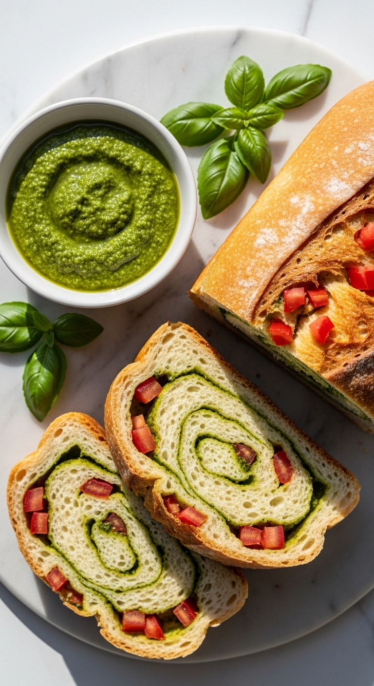 Basil pesto creates a vivid green swirl against sun-dried tomato in this visually striking loaf. The pesto adds herbaceous oiliness.