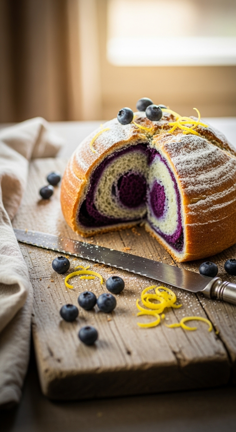This lemon blueberry sourdough swirl loaf creates a marbled interior with pockets of fruit and lemon. The swirl technique adds visual interest and distributes blueberries beautifully. It's showy for gatherings and tastes as good as it looks. You’ll notice streaks of purple and bright lemon in each slice.
