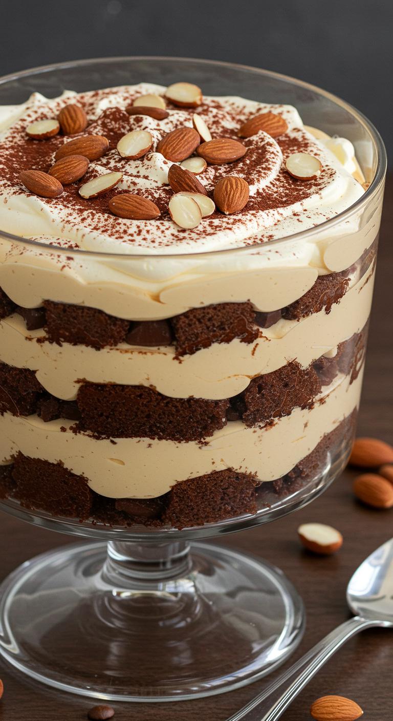 - Just before serving, sprinkle with toasted sliced almonds and dust with cocoa powder or extra grated chocolate.