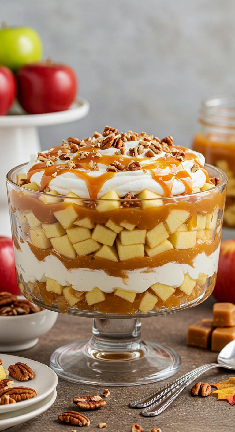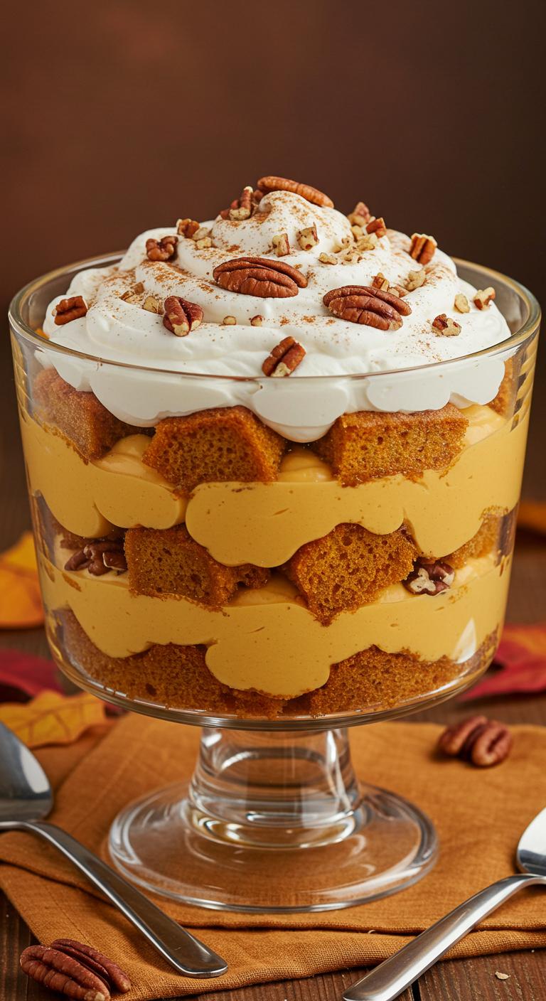 A cozy, autumnal trifle that layers pumpkin spice cake, maple-sweetened custard, and crunchy pecans for a perfect fall dessert.