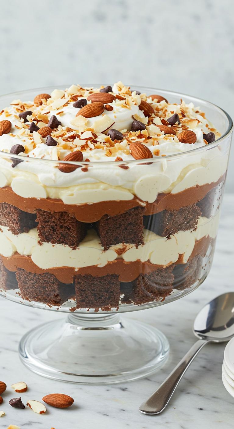 A crowd-pleasing, gluten-free Almond Joy trifle that layers chocolate, coconut, and almonds for a fun, no-fuss dessert.