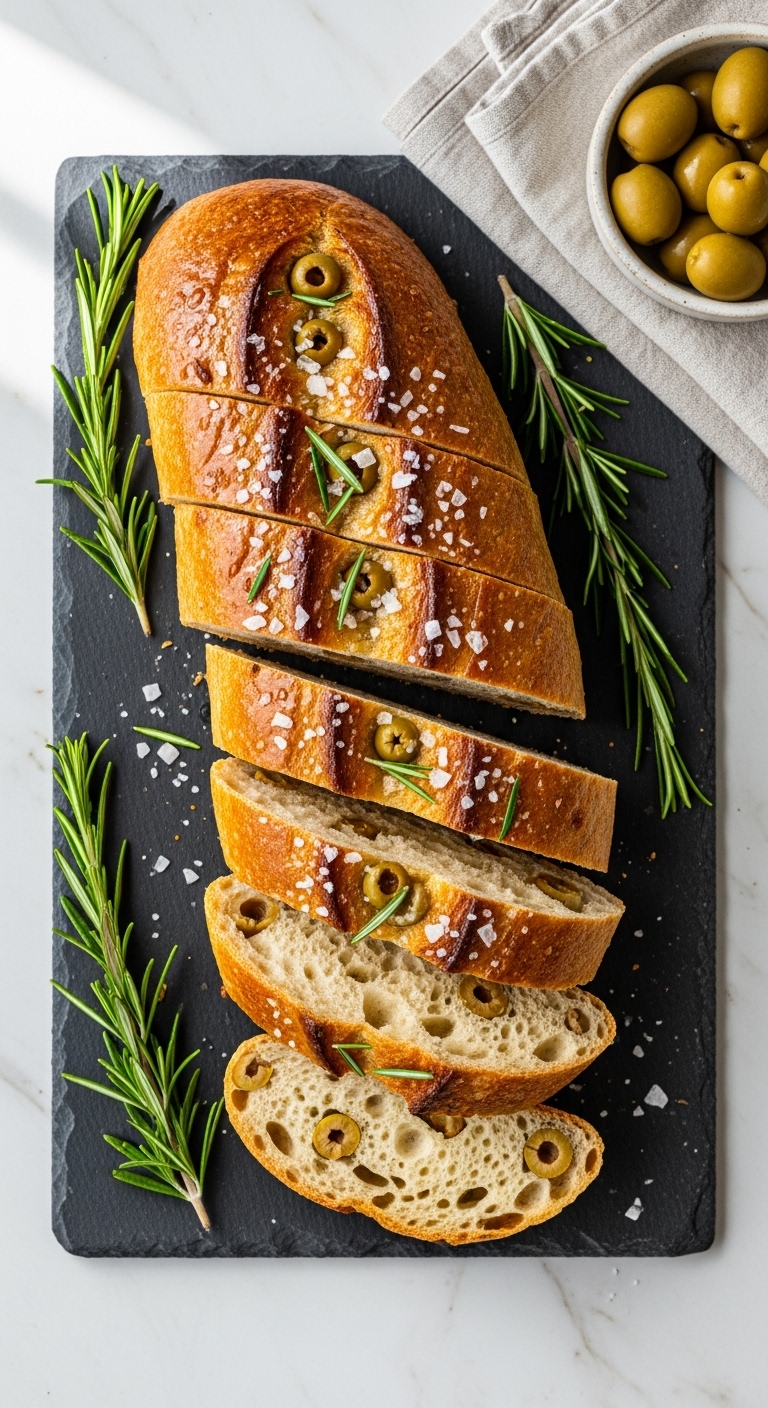 Slice and serve warm with olive oil for dipping. Garnish with extra rosemary sprigs and olives on the board. Pairs well with roasted lamb, Greek salads, or sharp Manchego. Store wrapped at room temperature for 2 days, or freeze slices. Make ahead by refrigerating shaped loaves for up to 24 hours.