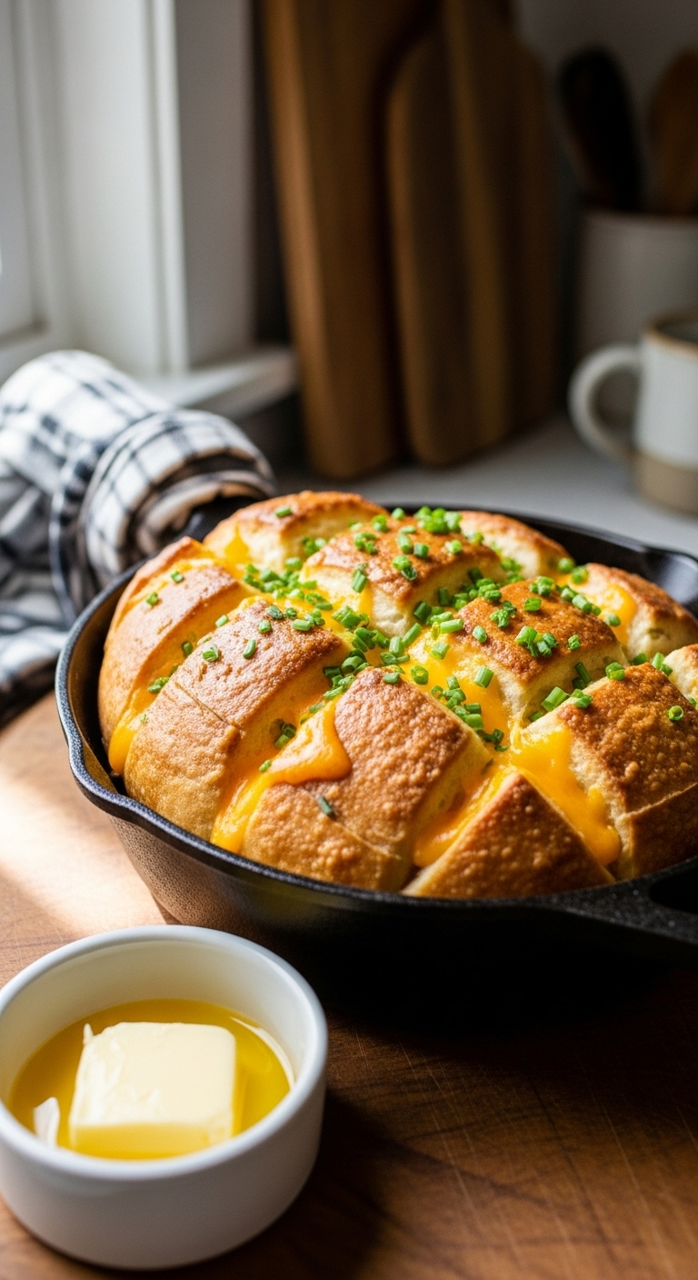 Serve warm straight from the skillet for communal pulling. Garnish with extra chopped chives and flaky sea salt. Pair with tomato soup, roasted veggies, or cold charcuterie. Store leftovers in fridge up to 3 days, reheat in oven to refresh crust. Make ahead and freeze unbaked; thaw and bake as directed.