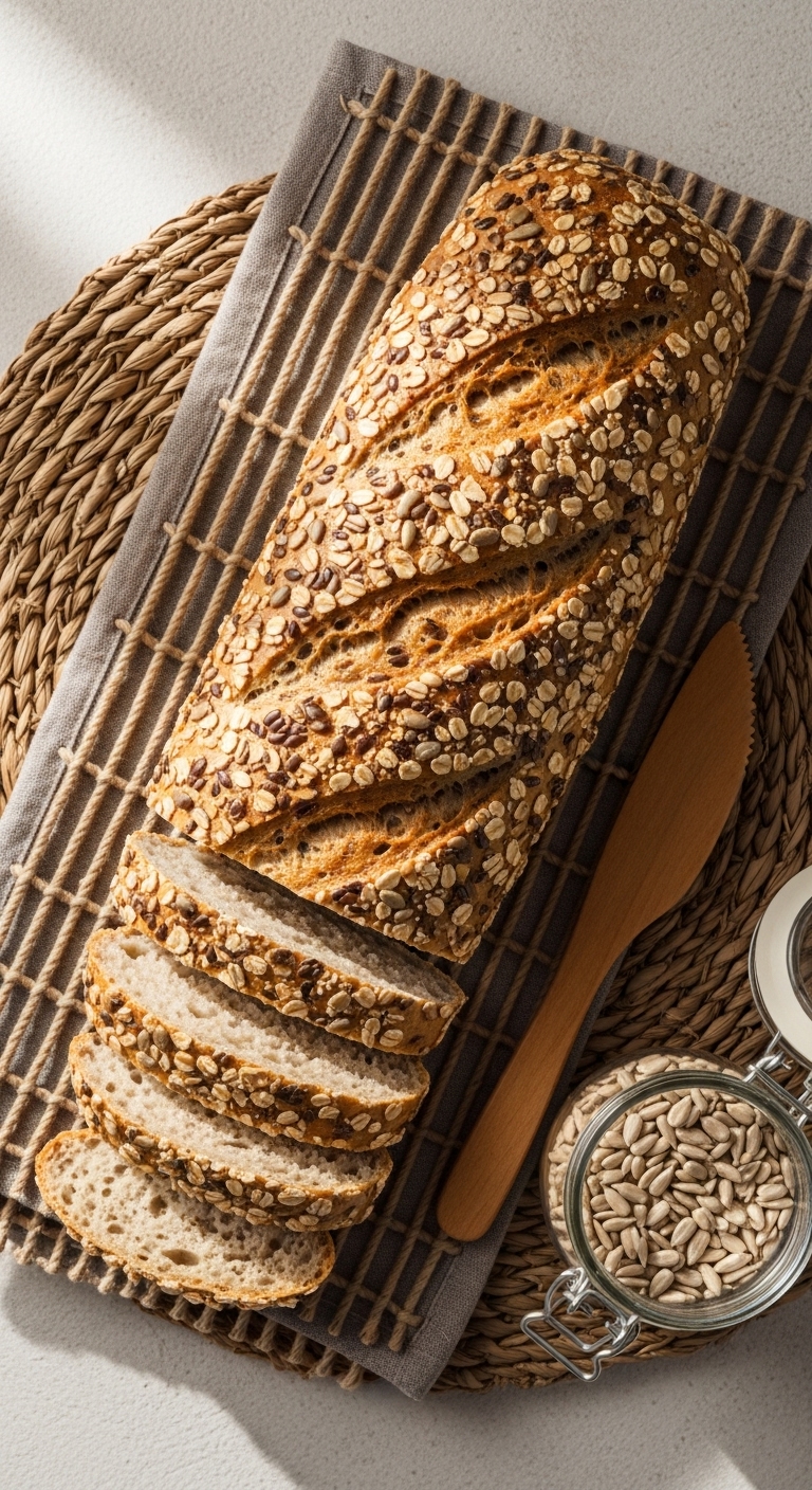 Slice thin for toasts topped with avocado or hummus. Garnish with extra sunflower seeds and microgreens. Pairs with fresh salads, smoked salmon, or soft cheeses. Store at room temp for 2–3 days, then freeze. This loaf is seasonal for spring and summer lunches.