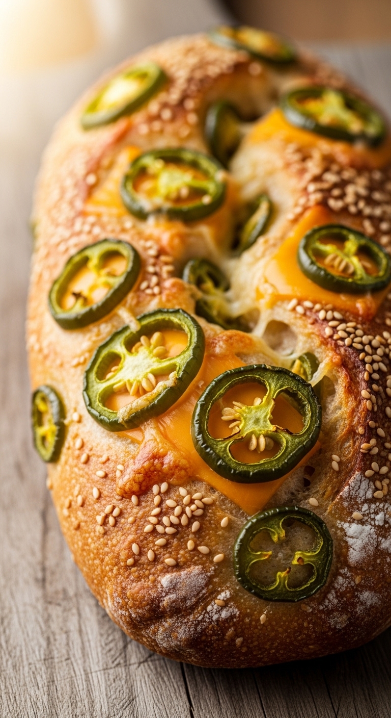 Add spice and melty cheese with this Jalapeño Cheddar sourdough. Fresh jalapeños bring brightness and heat, while sharp cheddar adds gooey richness. It’s great for sandwiches, burgers, or spicy toast. You’ll taste tangy sourdough contrast against molten cheese and peppery jalapeño.