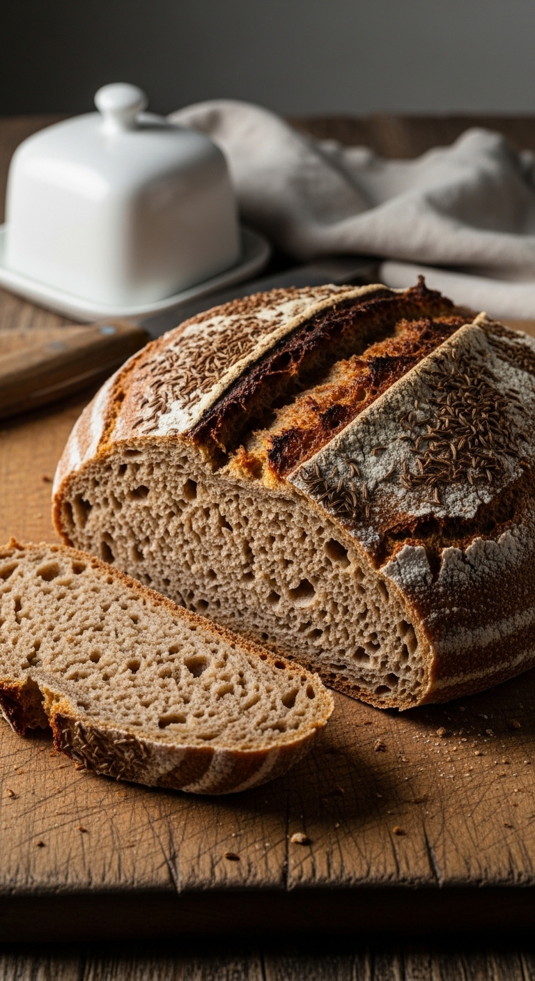 Serve dense slices with smoked salmon, pickles, or strong cheeses. Garnish with butter and extra caraway. Pairs with dark beers, robust coffee, or chilled white wine. Store wrapped at room temp for 3–4 days, or freeze. Great for hearty winter meals and rustic boards.